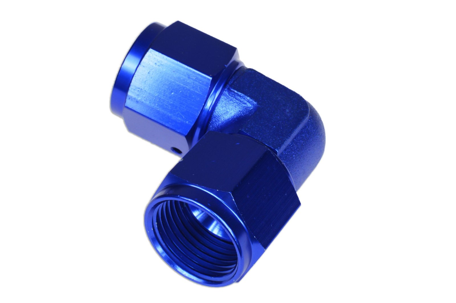 Adaptador AN6 de 90°, acoplamiento hembra-hembra para manguera, color azul.