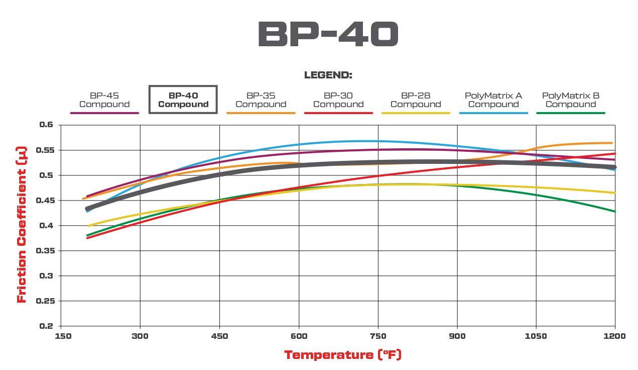 Temperature range and overall friction value are the primary considerations for pad selection. The pads must maintain the proper amount of friction for stopping power within the temperatures that will be realized on the track. Overall wear rate must also be considered. For most asphalt and road race applications, compounds in the high-temperature range over 1000°F are usually necessary. Dirt track, drag race, and street performance applications usually operate at temperatures between 500° and 1000°F. Keep in mind that these are general ranges and not absolute values. Many factors and unforeseen influences can affect brake temperatures. The best indicator for pad selection will always be on-track performance. If pad fade (friction loss) due to overheating occurs, improved cooling, a heavier rotor, or a higher temperature range pad may become necessary.
