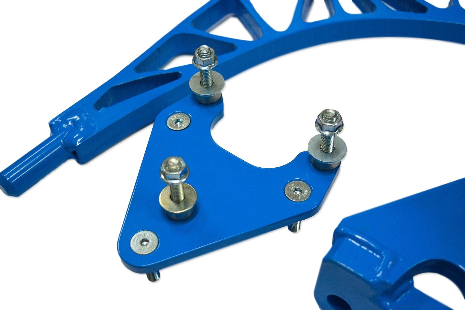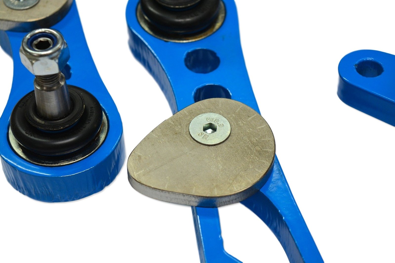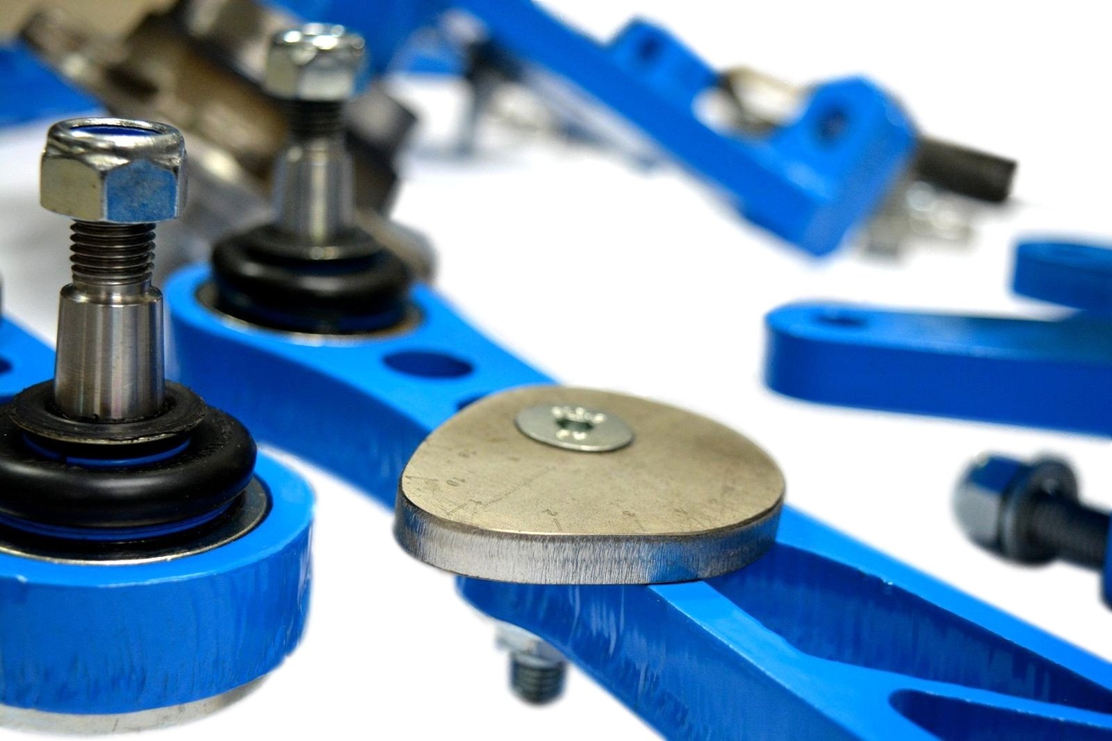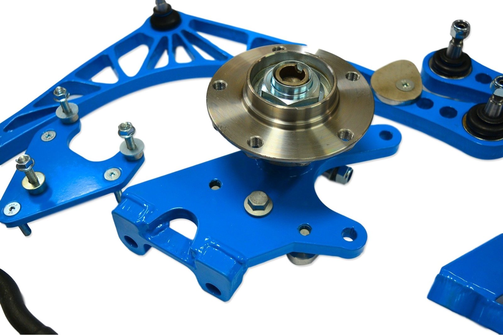 Ackerman’s factory correction has been completely and permanently removed. Very large steering angle of up to 70 degrees (+ -5 depending on the elements used and the body). The set is designed that way so the front wheels can work in parallel throughout the entire steering range. The steering discrepancy up to 40 degrees does not exceed 15 minutes (1/4 degree) – which is completely unattainable on standard welded switches. The crossovers are completely redesigned in the 3D CAD environment, made on modern machines and by qualified, certified professionals. Crossovers reduce so-called bump-steering by restoring the nominal (factory) position of the swingarm in a low lowered car. The switches lower the roll-center realistically by moving the wheel attachment point upwards. Switches extend the suspension by an additional 3 cm – thanks to this there is no need for additional wheel spacers, and thuis significantly reduces unsprung mass. Switches adapted to reinforced rod ends from BMW E46. The swingarms are made of structural steel, cut precisely by CNC. Top relocators of the shock absorber made of aluminum alloys. Includes a set of new reinforced screws with a hardness of 10.9.