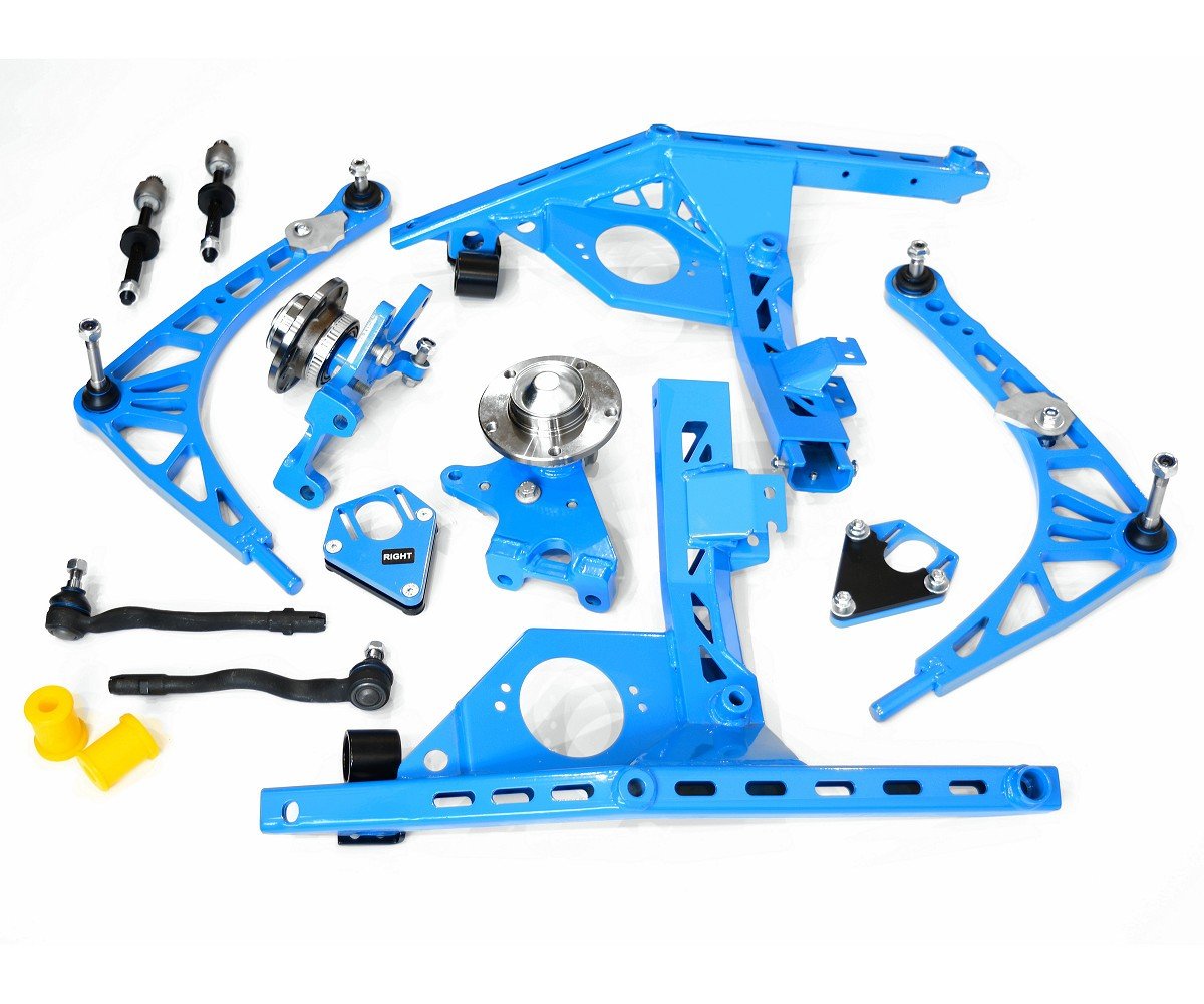 Ackerman’s factory correction has been completely and permanently removed. Very large steering angle of up to 70 degrees (+ -5 depending on the elements used and the body). The set is designed that way so the front wheels can work in parallel throughout the entire steering range. The steering discrepancy up to 40 degrees does not exceed 15 minutes (1/4 degree) – which is completely unattainable on standard welded switches. The crossovers are completely redesigned in the 3D CAD environment, made on modern machines and by qualified, certified professionals. Crossovers reduce so-called bump-steering by restoring the nominal (factory) position of the swingarm in a low lowered car. The switches lower the roll-center realistically by moving the wheel attachment point upwards. Switches extend the suspension by an additional 3 cm – thanks to this there is no need for additional wheel spacers, and thuis significantly reduces unsprung mass. Switches adapted to reinforced rod ends from BMW E46. The swingarms are made of structural steel, cut precisely by CNC. Top relocators of the shock absorber made of aluminum alloys. Includes a set of new reinforced screws with a hardness of 10.9.