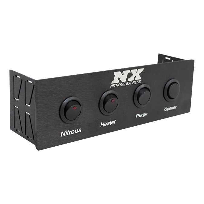 The Universal Radio Din Switch panel has four switches Nitrous, Heater, Purge, and Opener. The nitrous and heater switches use an on/off switch with a red LED so you know when they are armed. The purge is a rocker switch and the opener is a double rocker that reverses polarity to open or close the bottle valve.