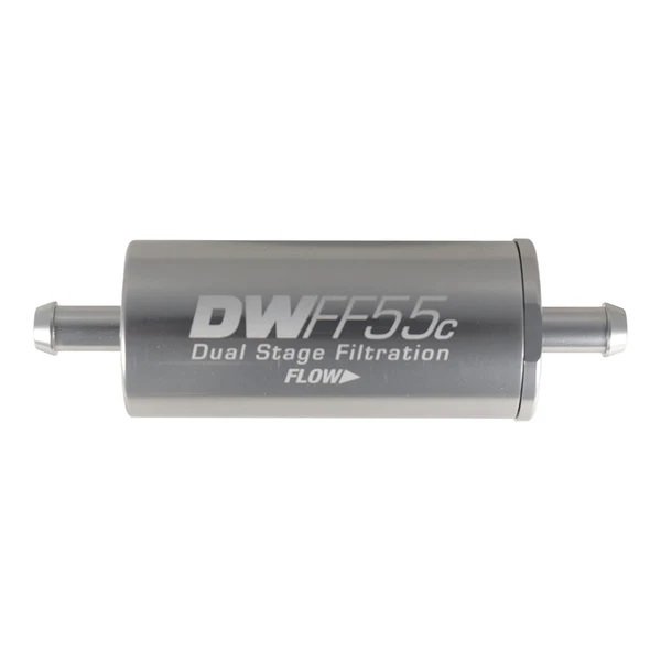 DW in-line fuel filters are compatible with a wide range of fuels, including pump gas, race gas, MTBE, ethanol, methanol, and diesel. DW recommends a maximum service interval of 12 months or 12,000 miles. Shorter service intervals are recommended with harsher conditions and corrosive fuels.