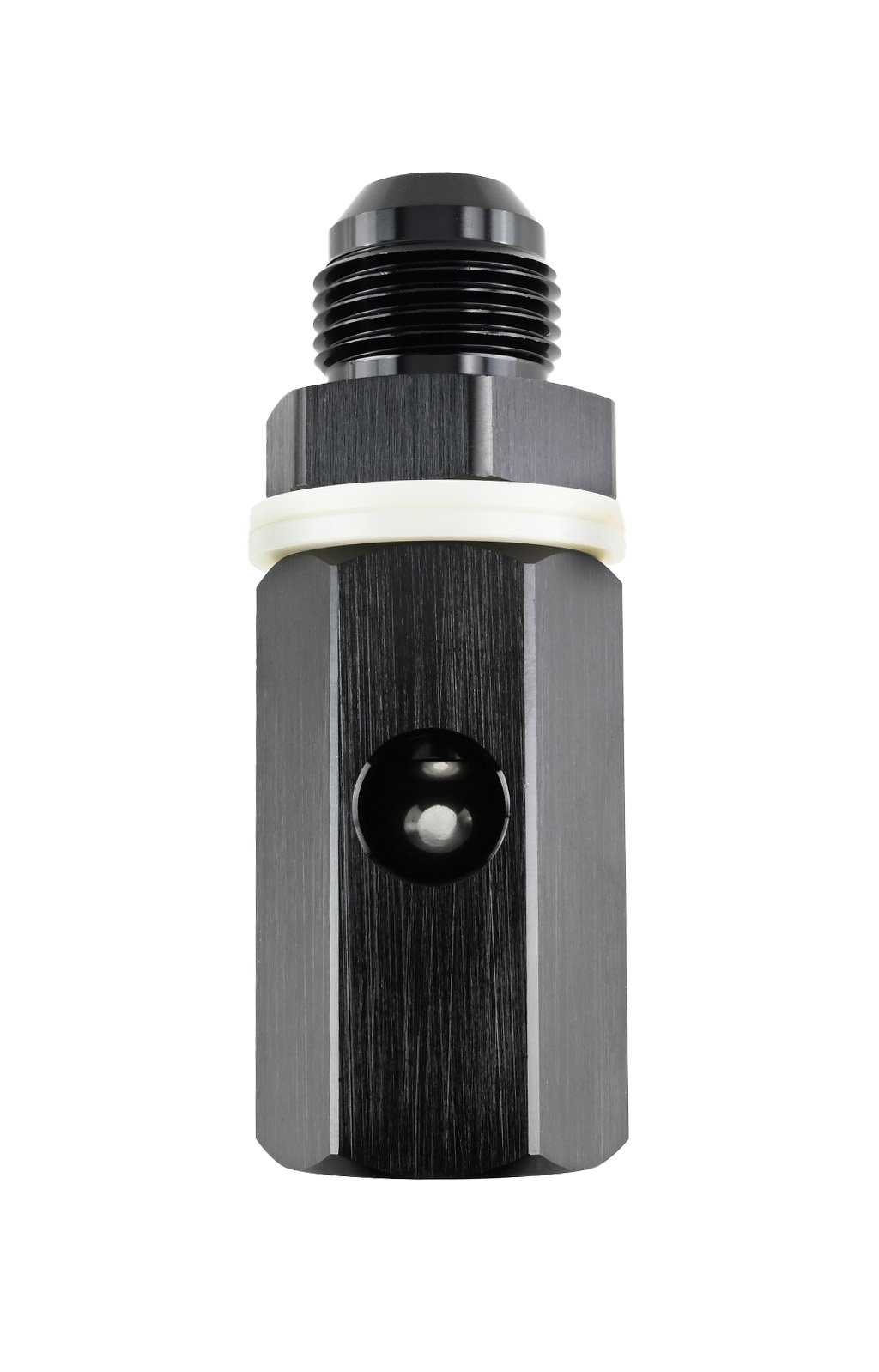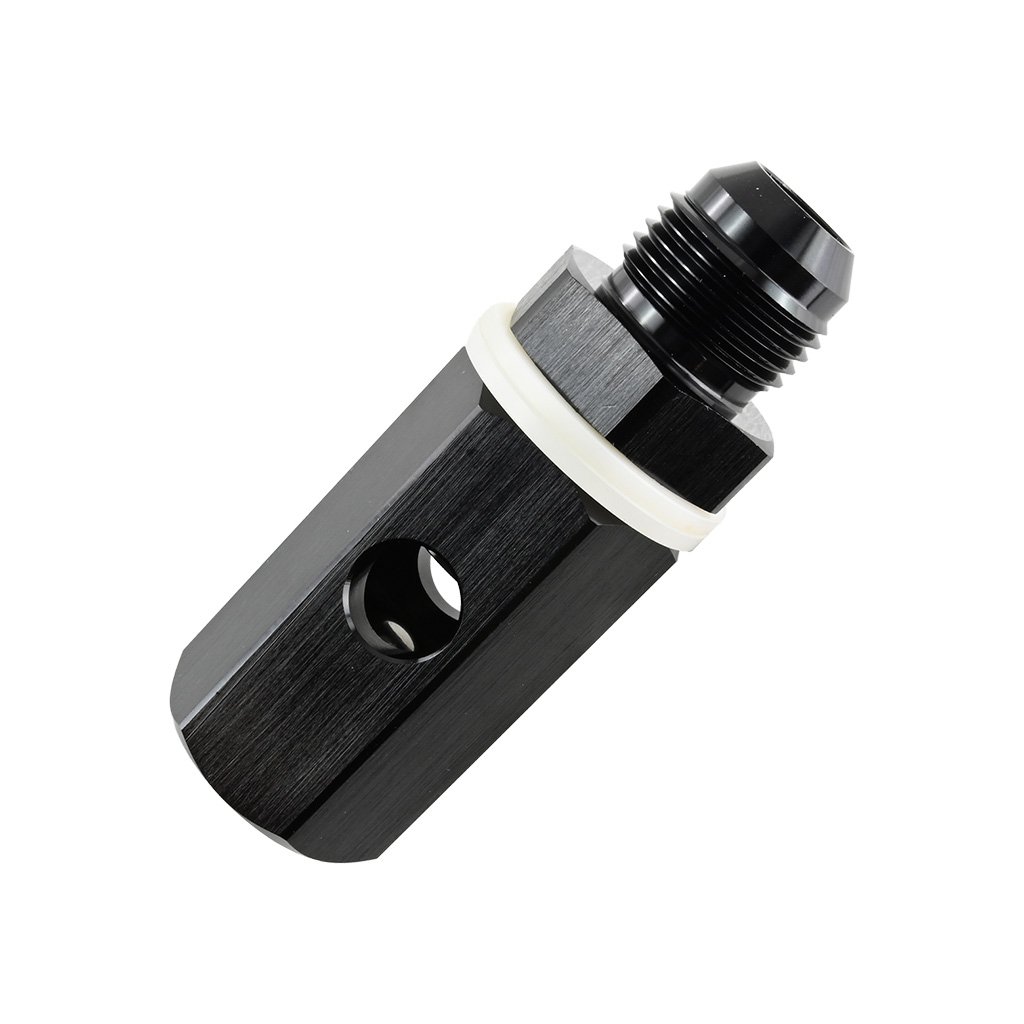 A gravity-operated ball check valve is a reliable safety device for fuel systems. It remains open in a vertical position and automatically closes when tilted by at least 90 degrees — the ball inside the valve gravitationally cuts off the fuel supply. It prevents fuel leakage in situations such as vehicle rollover. Made of lightweight and durable aluminum, it is designed for vertical installation in AN10 fuel lines. Compatible with all types of fuel, including methanol and E85.
