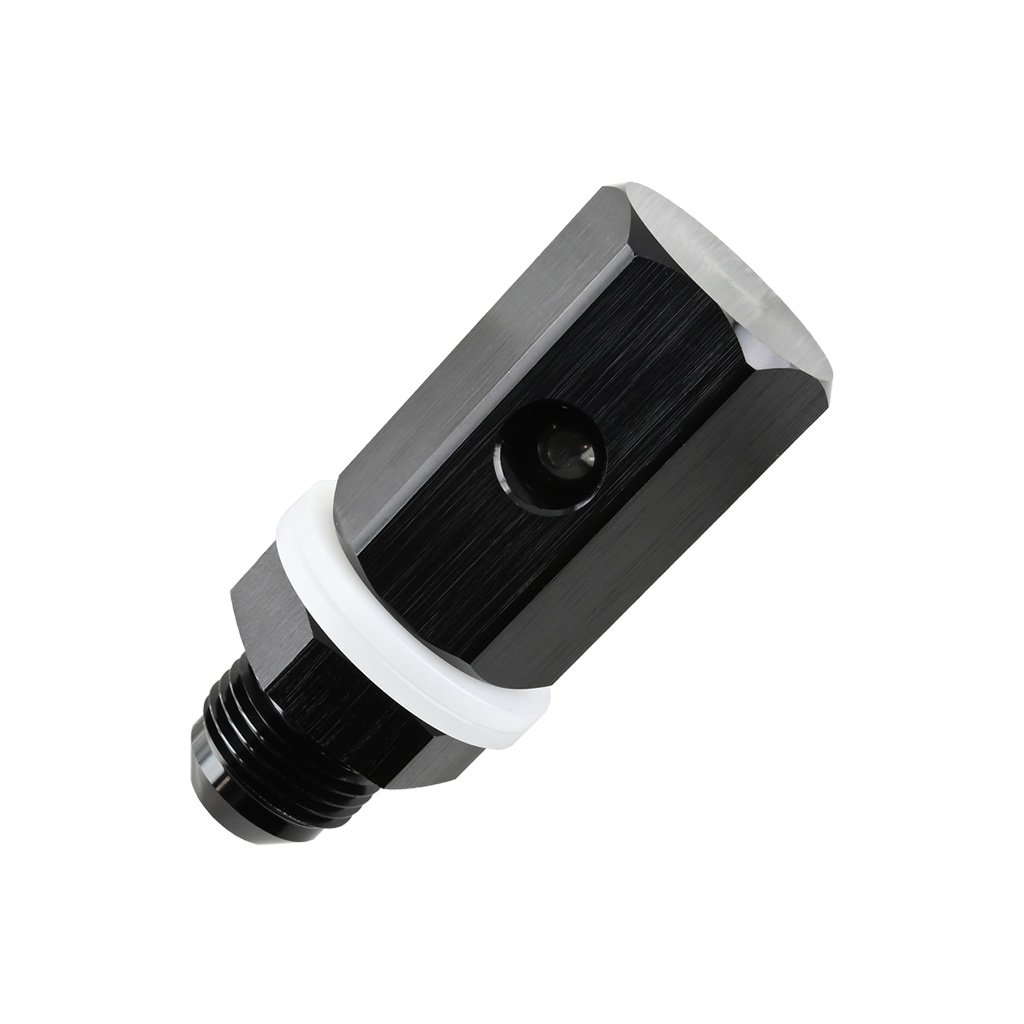 A gravity-operated ball check valve is a reliable safety device for fuel systems. It remains open in a vertical position and automatically closes when tilted by at least 90 degrees — the ball inside the valve gravitationally cuts off the fuel supply. It prevents fuel leakage in situations such as vehicle rollover. Made of lightweight and durable aluminum, it is designed for vertical installation in AN8 fuel lines. Compatible with all types of fuel, including methanol and E85.