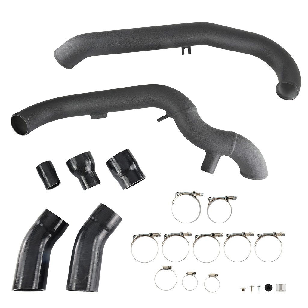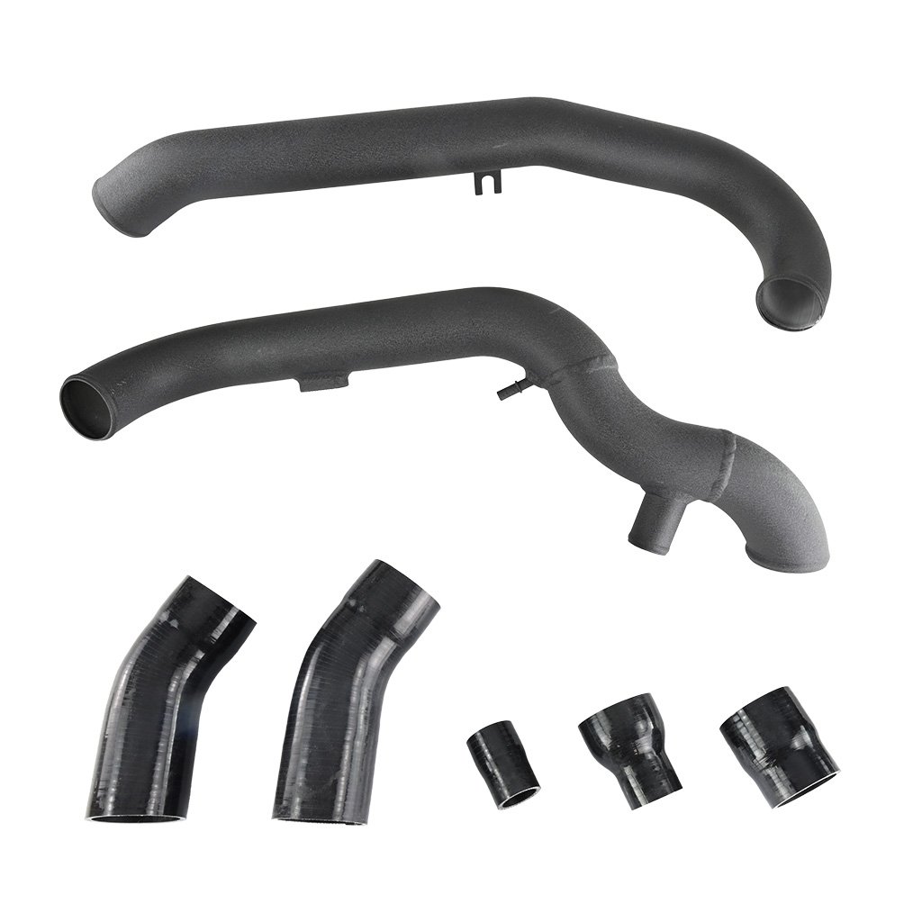 The FMIC.EU intercooler pipe kit features enlarged-diameter aluminum pipes that significantly reduce airflow turbulence and improve turbocharger efficiency and response. The pipes are powder-coated and supplied with silicone couplers, seals, and clamps for reliable and leak-free installation.