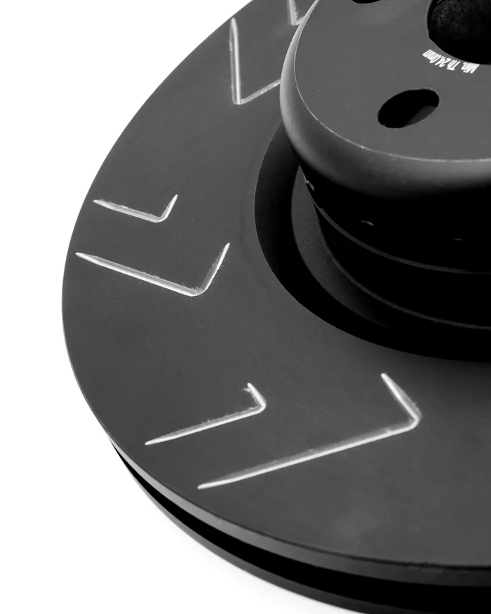 On the road, these directional grooves generate less noise compared to straight or curved groove designs and avoid the fatigue cracking often seen in drilled discs after repeated heat cycles.