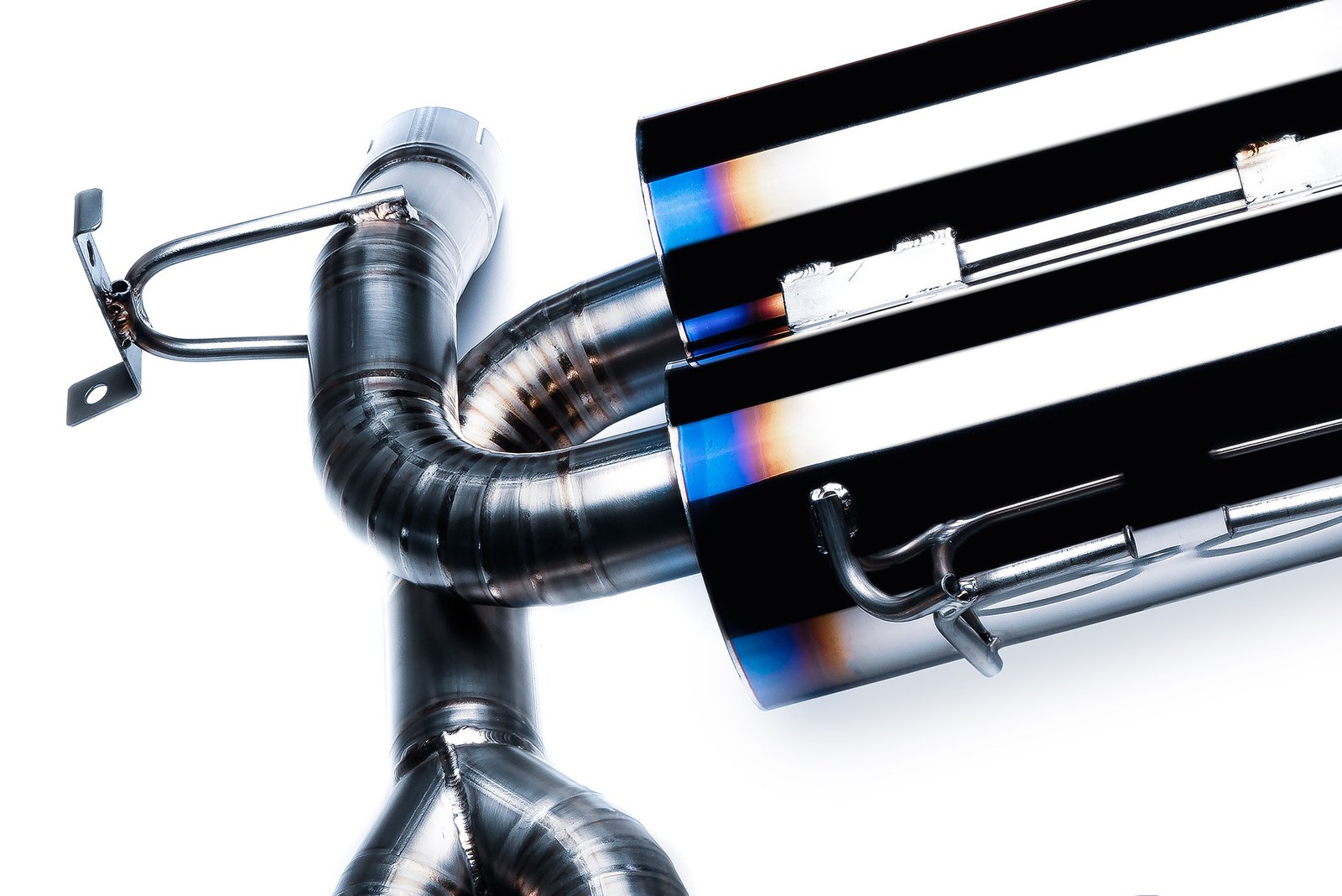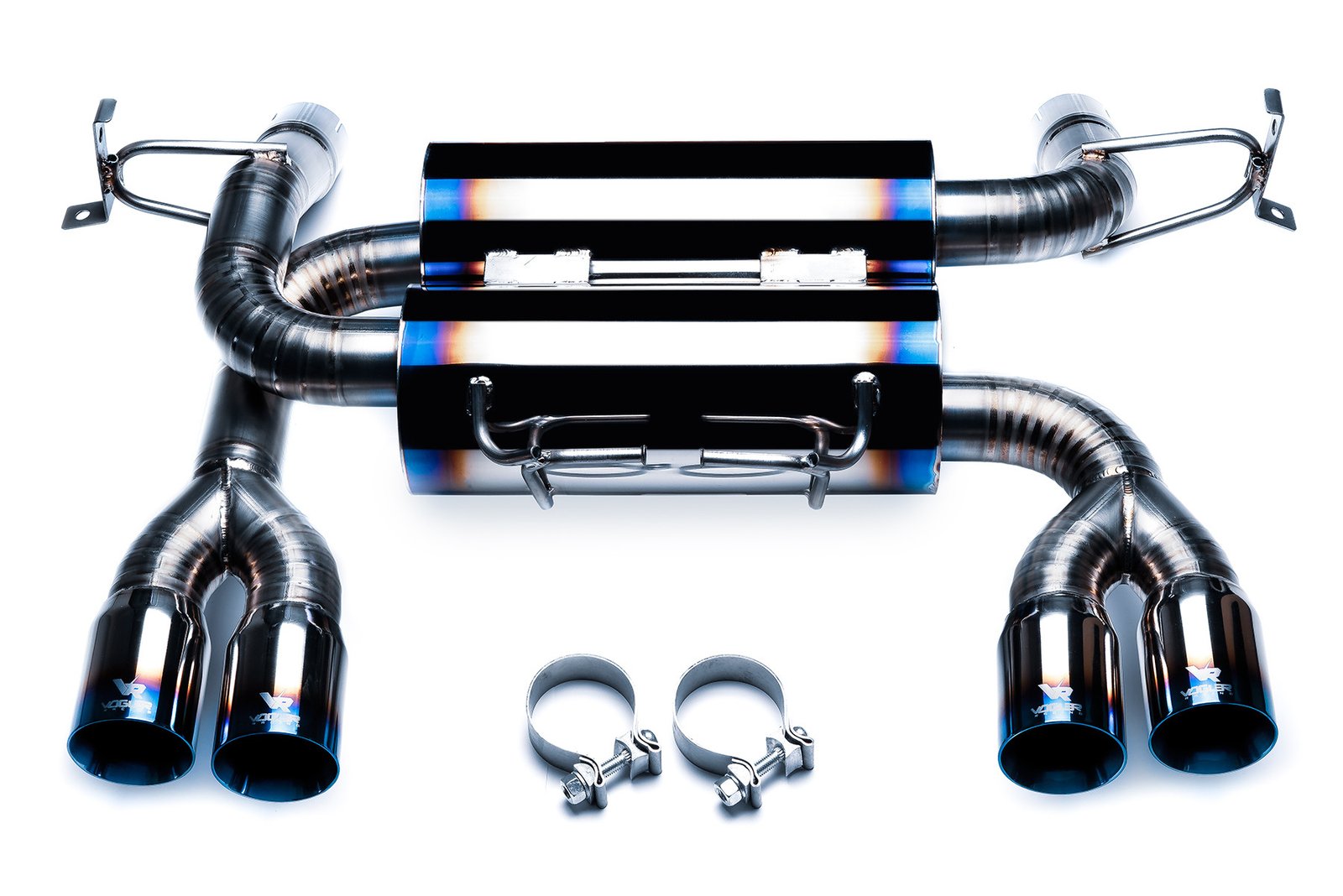 Vogler Racing titanium exhaust designed from scratch with properly calculated pipe diameters and perfectly matched muffler sizes in order to increase engine power and torque. Exhaust provides maximum weight reduction over regular stainless steel exhaust systems and guarantee excellent durability. Due to its design it reduces back pressure in the exhaust system. Vogler Racing exhausts also significantly improveing visual aspects of the car and above all quality of sound emitted by the exhaust. Compared to steel titanium is resistant to corrosion, very lightweight and extremely durable at the same time. As a result contact of titanium with oxygen a passivation layer of titanium oxide with a thickness of about 2 nm is formed on its surface and that increases resistance to corrosion. Lightweight and high strength in relation to the material density and high melting point mean that titanium is used to build the most modern aircraft, including stealth fighters and space shuttles.