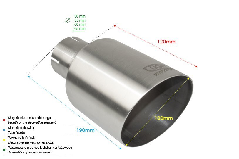 The Ulter Sport exhaust tip is a perfect solution when looking for high-quality components for the construction of your exhaust systems. Advanced technology and precise design, Ulter Sport exhaust tips ensure perfect exhaust gas flow, extracting maximum power from the engine and emphasizing the sound of engine and exhaust. Available in various configurations and styles, Ulter Sport exhaust tips enhance the appearance of your car, adding a sporty character and an sport sound. Additionally, the use of high-quality materials, such as polished stainless steel, guarantees long-term durability and corrosion resistance. Ulter Sport exhaust tips work perfectly with your car’s existing exhaust system to ensure smooth exhaust flow. Whether you want to improve the performance of your sports car or simply make optical modifications, Ulter Sport exhaust tips will surely meet your expectations. Thanks to their installation, your car will not only gain an additional strong sound, but will also gain in appearance, becoming a unique and individual vehicle. If you are looking for a proven solution that combines high quality workmanship, efficiency and aesthetics, Ulter Sport exhaust tips are the perfect choice for you. Give your car even more character by choosing a product from Ulter Sport company. The end tip should be installed using a clamp or welding. The tip is made in Poland. Made of the highest quality steel.