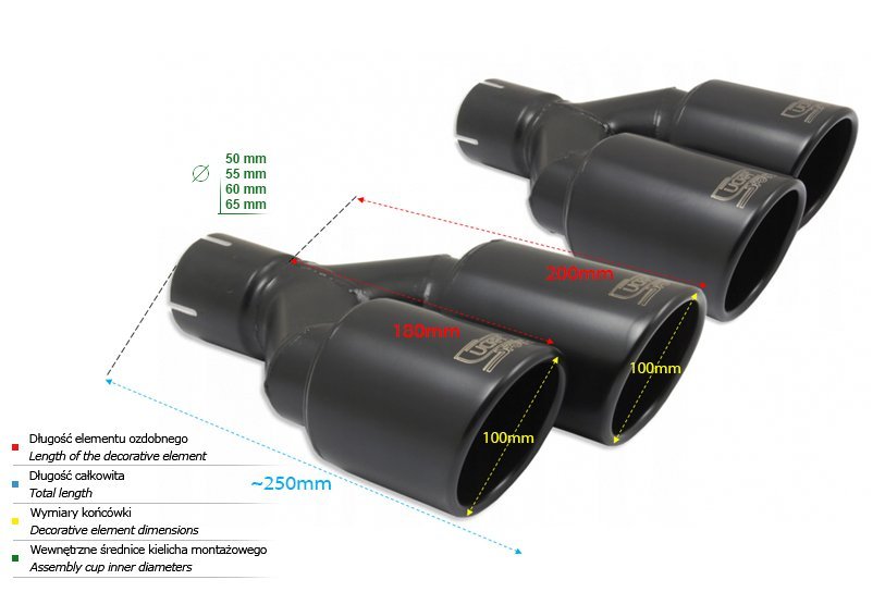 The Ulter Sport exhaust tip is a perfect solution when looking for high-quality components for the construction of your exhaust systems. Advanced technology and precise design, Ulter Sport exhaust tips ensure perfect exhaust gas flow, extracting maximum power from the engine and emphasizing the sound of engine and exhaust. Available in various configurations and styles, Ulter Sport exhaust tips enhance the appearance of your car, adding a sporty character and an sport sound. Additionally, the use of high-quality materials, such as polished stainless steel, guarantees long-term durability and corrosion resistance. Ulter Sport exhaust tips work perfectly with your car’s existing exhaust system to ensure smooth exhaust flow. Whether you want to improve the performance of your sports car or simply make optical modifications, Ulter Sport exhaust tips will surely meet your expectations. Thanks to their installation, your car will not only gain an additional strong sound, but will also gain in appearance, becoming a unique and individual vehicle. If you are looking for a proven solution that combines high quality workmanship, efficiency and aesthetics, Ulter Sport exhaust tips are the perfect choice for you. Give your car even more character by choosing a product from Ulter Sport company. The end tip should be installed using a clamp or welding. The tip is made in Poland. Made of the highest quality steel.